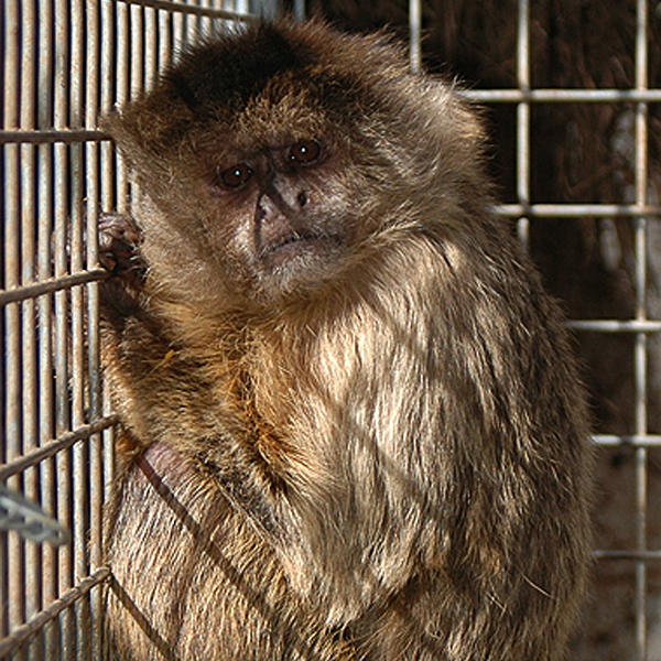 Ejemplar confiscado en el Aeropuerto de Schiphol en Amsterdam, Holanda. Viajaba dentro de una caja de madera diminuta, totalmente amarrada para que no se moviera. La consecuencia fue una dislocación de cadera y fracturas que soldaron con los años dejándola coja. Presenta comportamiento hiperagresivo hacia los humanos. Gracias a la rehabilitación realizada en la Fundación, es un animal totalmente autosuficiente a pesar de su discapacidad. Trasladada a la Fundación Neotrópico gracias a la colaboración del STICHTING AAP.